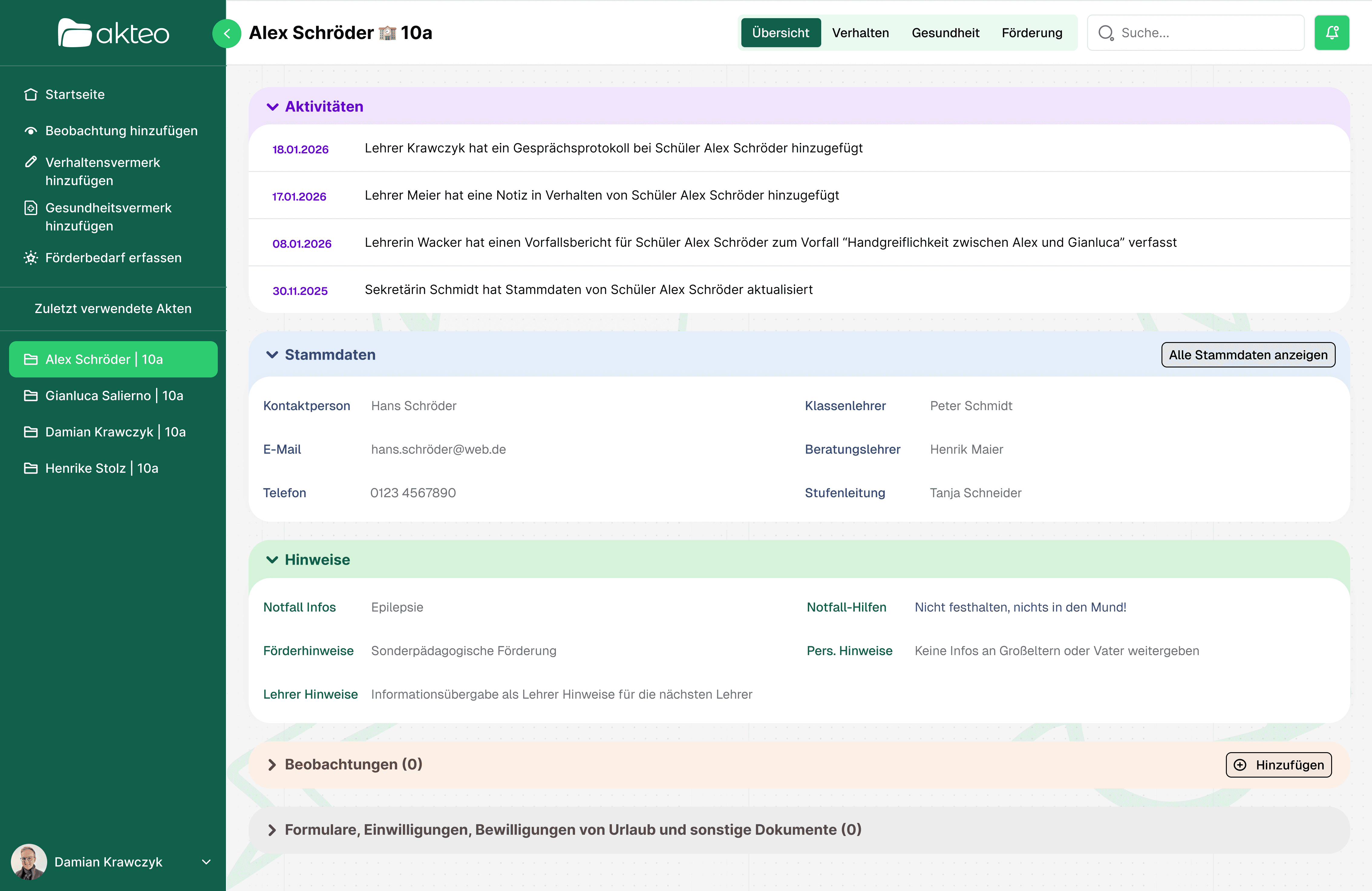 akteo bündelt Verhalten, Gesundheit und Förderung in einem System und macht Prozesse, Dokumentation und Auskünfte im Schulalltag endlich schnell und sauber.